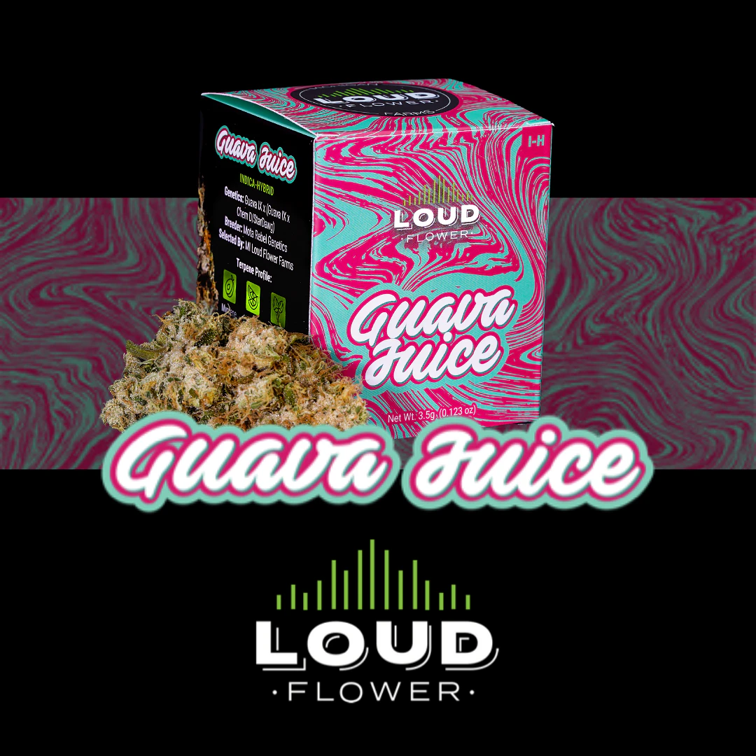 Effects: Sleep Aid, Nausea Relief, Stress Relief. Guava Juice, an MI Loud Flower exclusive strain, is a cross of Guava Guava IX x (Gauva IX x Chem D/StarDawg). This strain has a strong aroma of sweetness followed with that StarDawg exhale.