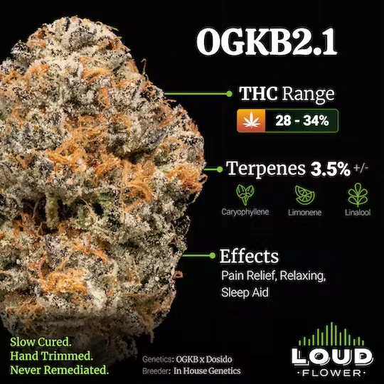 This is OGKB 2.1 from Michigan Loud. OGKB, also known as "OG Kush Breath," is a hybrid marijuana strain that is believed to be a descendant of Girl Scout Cookies. If you are looking for a heavy duty strain to ease your mind then look no further!