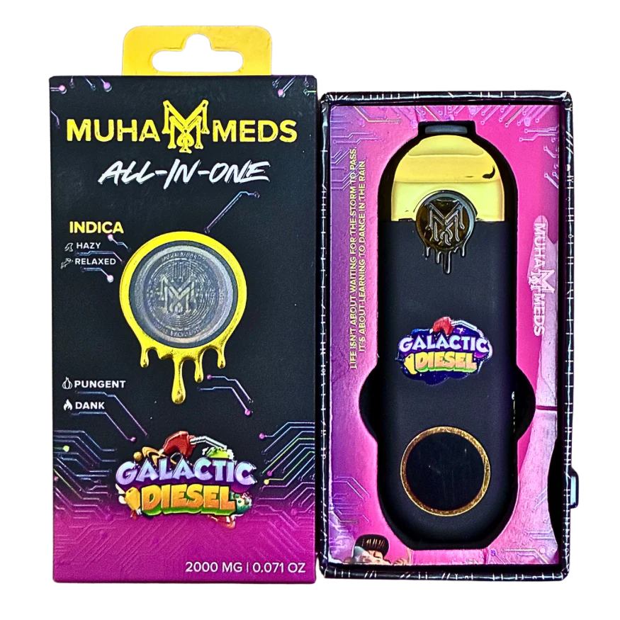 Discover the Muha Meds 2G Live Resin Disposable Vape Pen featuring the "Galactic Diesel" Indica strain. This strain delivers profound relaxation paired with a robust, earthy flavor profile enriched by hints of diesel and pine. The aroma is both pungent and grounding, creating a deeply immersive sensory experience. Designed for evening use, "Galactic Diesel" offers a soothing retreat from the day's stresses, inviting you to unwind and find peace in both body and mind.